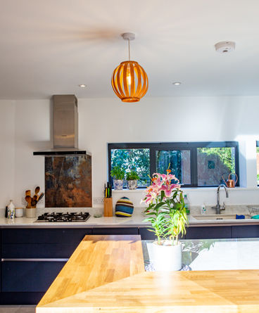 The former kitchen in the existing house has been divided to form a ground floor shower room with adjacent spare room for guests and/or home office. This allowed for the existing downstairs toilet to be removed from the utility room, so it could be opened to form a larger laundry and boot room.