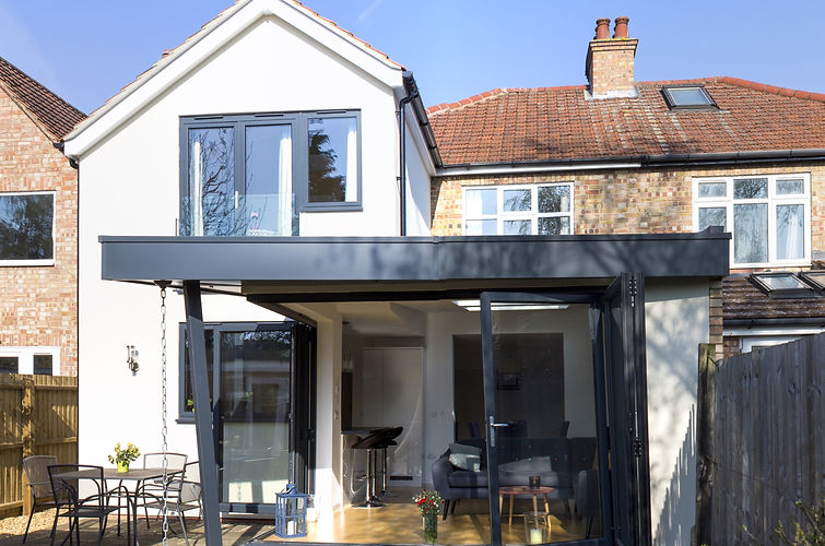 The rear single storey extension with its modern mono-pitched roof and raking overhang forms an open plan kitchen, dining, family room replacing the old draughty conservatory. The corner-less bifold doors allow a seamless extension of the living space into the garden opening onto a large patio with an outdoor dining space. The rain chain is an attractive alternative to the mundane rainwater pipe.