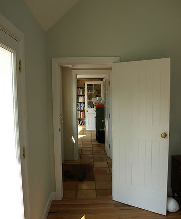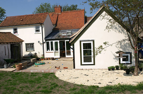 Single storey rear extension to listed farm house providing new bedroom and shower room, a south facing pitched roof accommodates evacuated tubes that provide solar hot water. External shutters allude to the style of the farmhouse outbuildings and prevent overheating in summer. A new glazed roof lights the dining room throughout the day.
