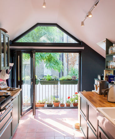 To achieve this, the ground floor accommodation was reordered. The utility and bathroom facilities were relocated into a side passageway, freeing up the rear of the house for a mixed-use living room and enabling wide openings at both ground and first floors to completely open up the full height bay. At first floor, the kitchen was extended out to the rear and opened up to the side with views onto the new living area below.