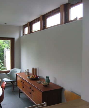 This modern extension in Haslingfield created a stylish, open plan family dining room opening off the remodelled kitchen. A frameless rooflight situated where the extension meets the two storey house provides daylight to the kitchen and creates a natural transition between the two spaces. High specification glazing and solar shading help protect the south façade dining room from over heating. The sliding folding doors form a strong connection with the garden, and the terrace immediately outside creates an outdoor room. The owners say the new room is a pleasure to use.